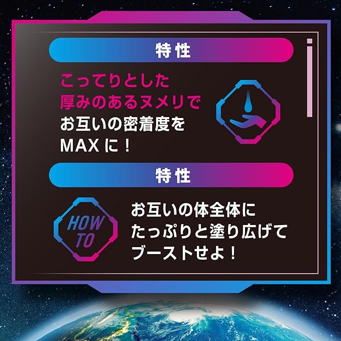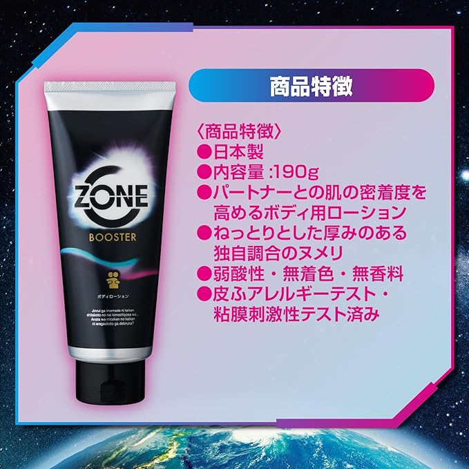 パートナーとの密着感度を高めるボディーローションの最終形。こってりとした厚みのあるヌメリで肌を包み込み、全身のうごめきを敏感に伝え合います。ZONEへ誘うボディコミュニケーションで愛を深めてください。